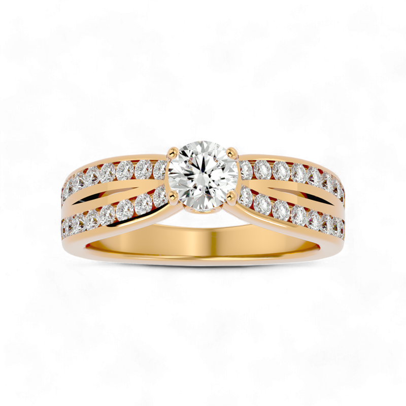The 1.4 Carat Round Endless Sparkle Solitaire Ring features a 1.4-carat round diamond centre, symbolizing brilliance and elegance. Enhanced by additional round diamonds, this ring sparkles beautifully. The golden setting complements its shine, making it a timeless piece perfect for any occasion.